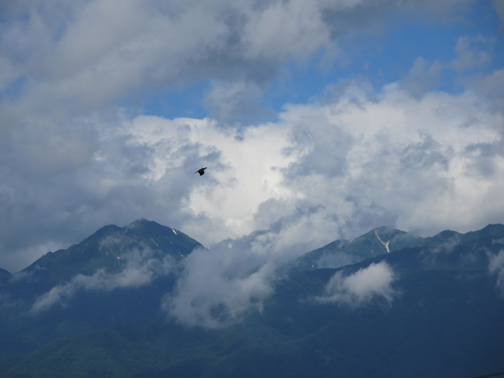 常念山脈を包み、低く垂れ込めた雨雲の下で、庭木の剪定や雑草取りに精を出していると、思わぬ発見をすることもある。